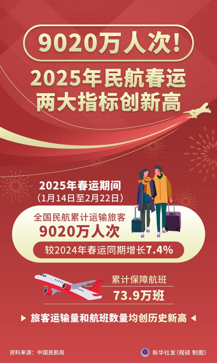 新华社北京2月23日电(记者 黄垚)记者23日从中国民航局获悉,2025年春运期间(1月14日至2月22日),全国民航累计运输旅客9020万人次,较2024年春运同期增长7.4%,累计保障航班73.9万班,旅客运输量和航班数量均创历史新高。