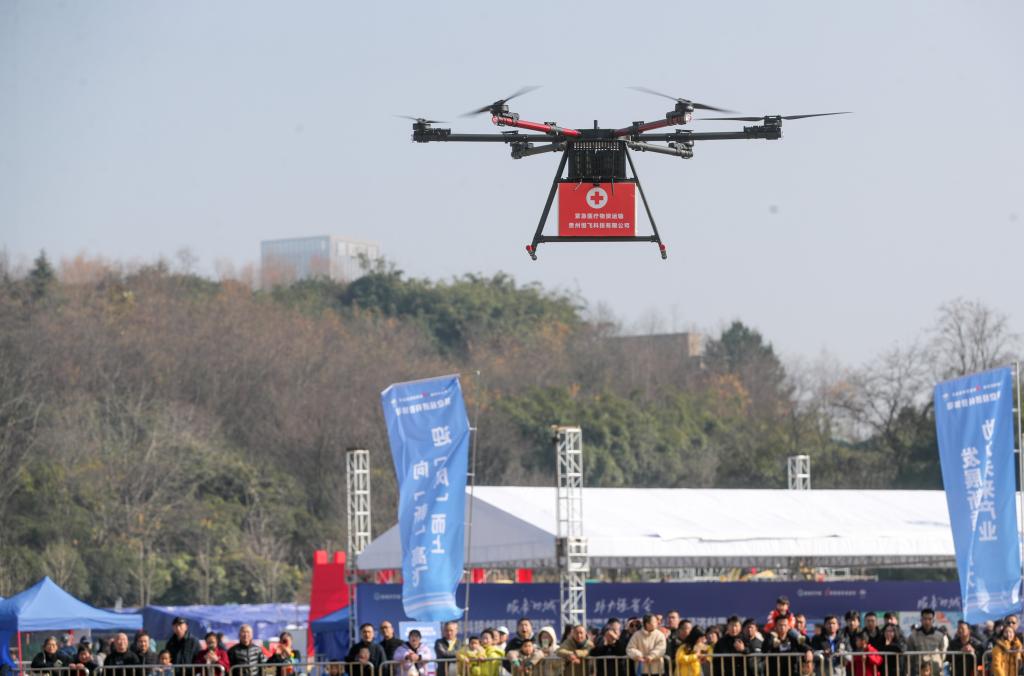 1月5日,在贵阳市观山湖区民族大联欢广场,民用运载无人机在模拟救援场景中运送救援物资。新华社发(袁福洪 摄)