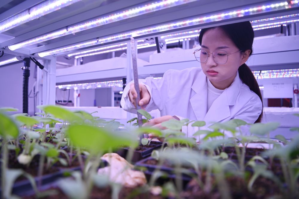 在位于天津滨海—中关村科技园的科芯(天津)生态农业科技有限公司,工作人员在植物工厂内测量生长数据(2月20日摄)。新华社记者李然摄
