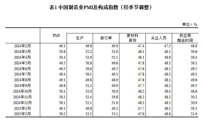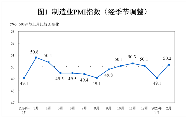 2月份,制造业采购经理指数(PMI)为50.2%,比上月上升1.1个百分点,制造业景气水平明显回升。