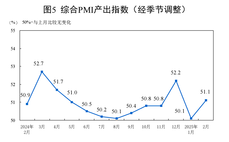 2月份,综合PMI产出指数为51.1%,比上月上升1.0个百分点,表明我国经济景气水平总体回升。