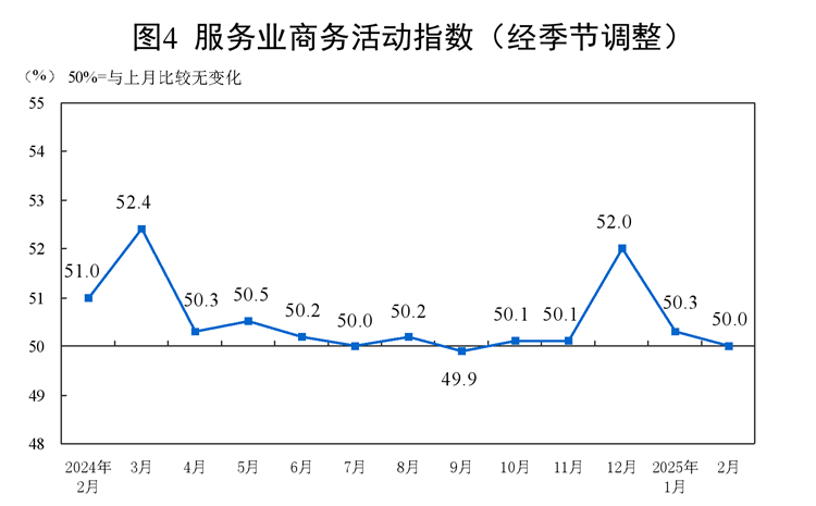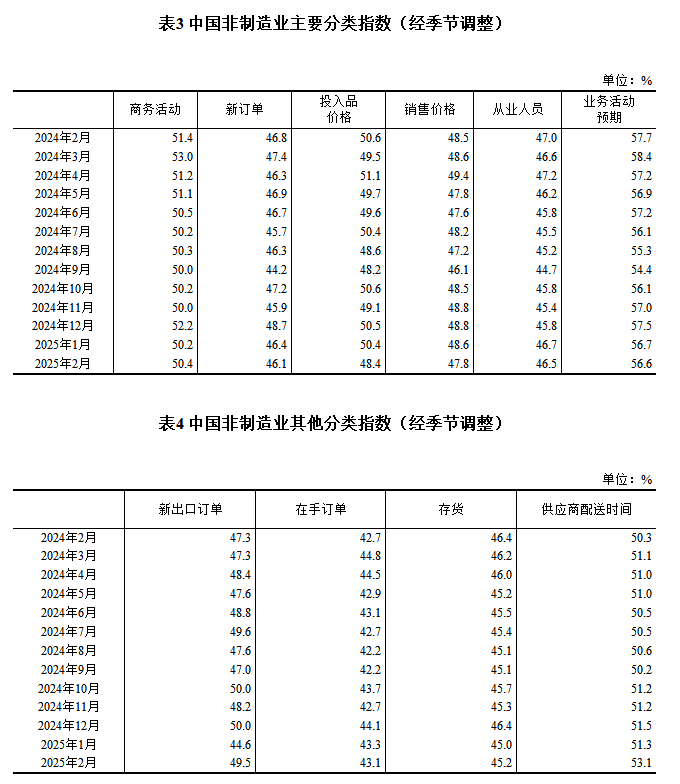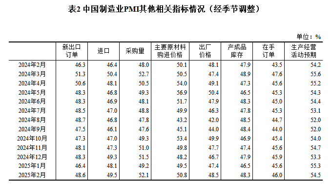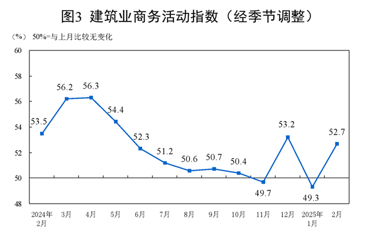 生产指数为52.5%,比上月上升2.7个百分点,表明制造业企业春节后生产活动较快恢复。
