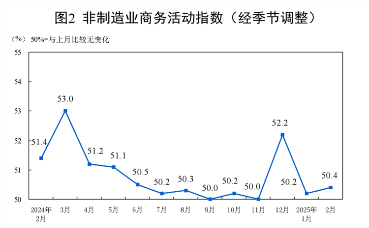2月份,非制造业商务活动指数为50.4%,比上月上升0.2个百分点,非制造业景气水平小幅回升。