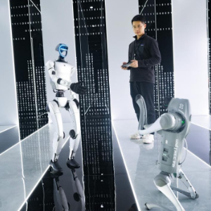 3月1日,在杭州宇树科技有限公司的产品展示中心,人形机器人和四足机器人在工作人员控制下做动作。新华社记者 翁忻旸 摄