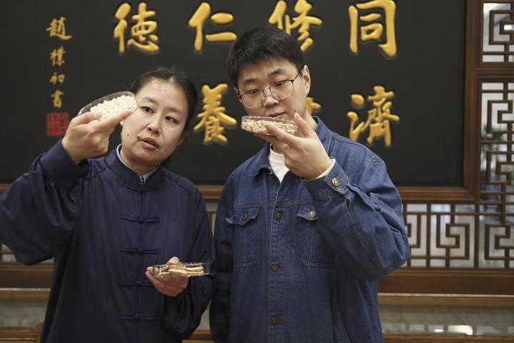 2月25日,北京同仁堂科技发展股份有限公司亦庄分厂技师李宁(左)在给徒弟传授中药选材知识。新华社记者 朱唯希 摄