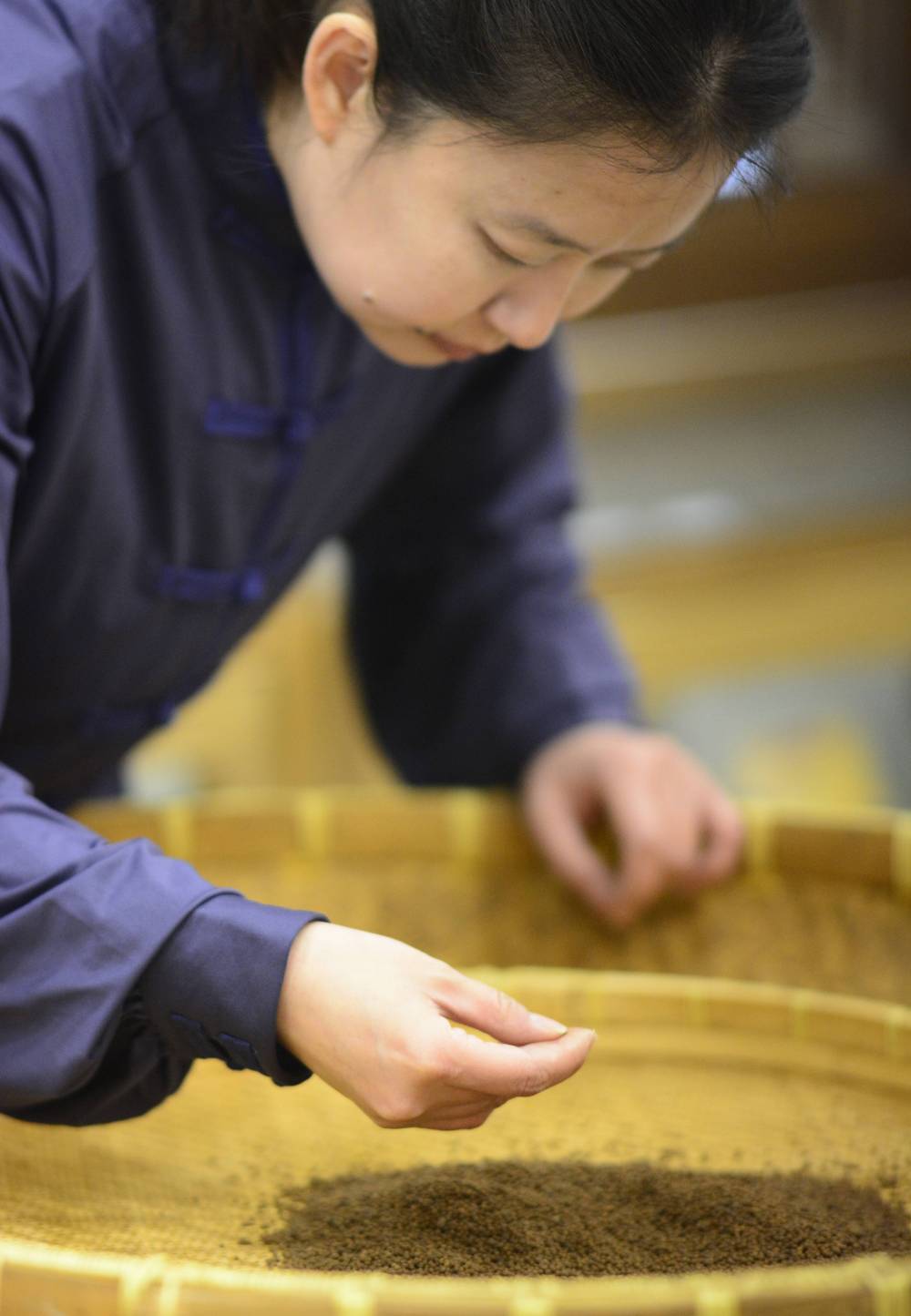 2月23日,同仁堂国家级非物质文化遗产生产性保护示范基地项目成员、中药炮制技艺首席技师吕建媛在展示传统中药材炒制技艺。新华社记者 李欣 摄