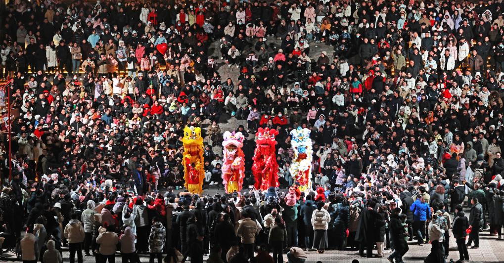 2025年1月29日,游客在山东省临沂市郯城县郯国古城景区观看舞狮表演。新华社发(张春雷摄)