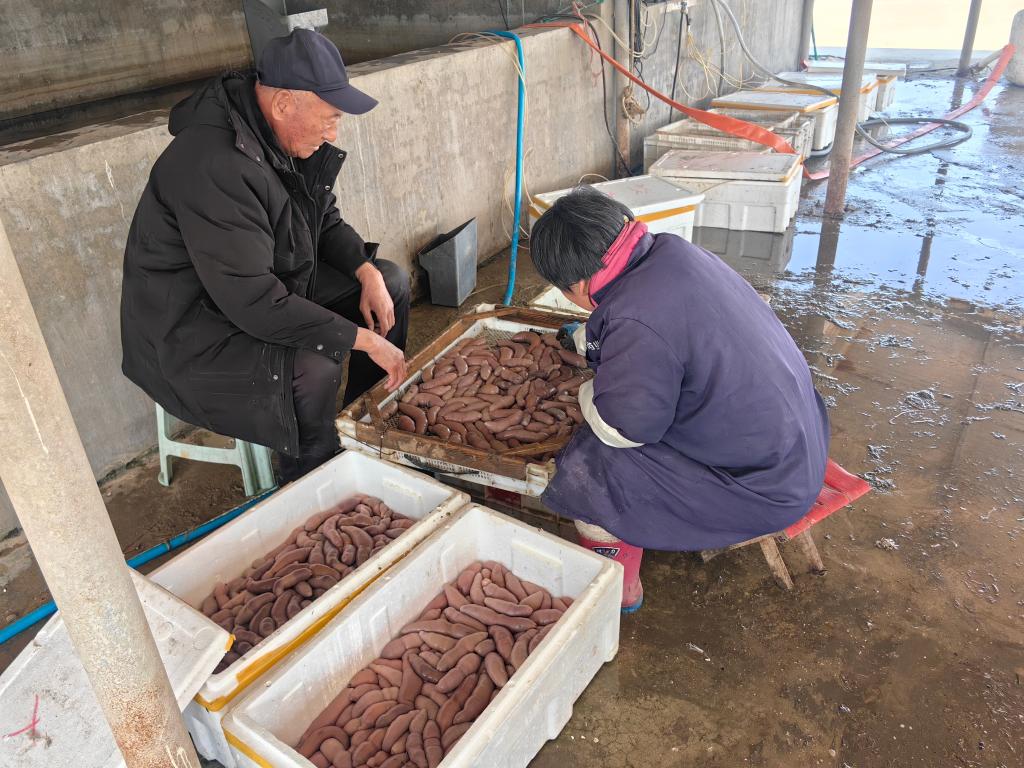 烟台蛤堆后水产品养殖专业合作社社员在分拣海肠。新华社记者 邵琨 摄