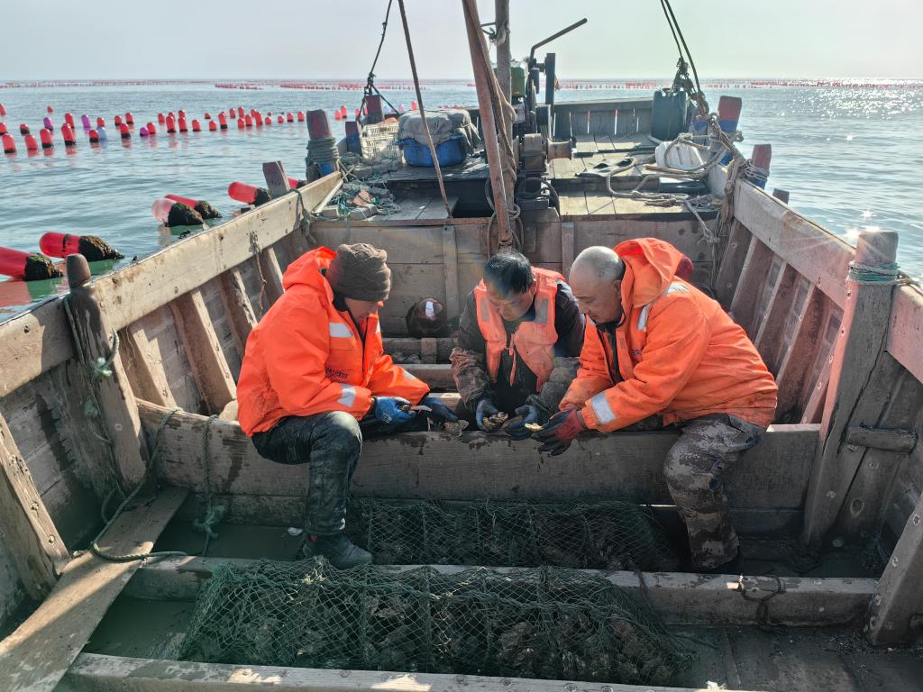 十几分钟后,整齐的浮漂和远处岛屿、渔船构成的“海上牧场”映入眼帘。到达作业地点,栾建国和同伴一起,将水中的养殖笼吊到船上,仔细查看牡蛎生长情况。