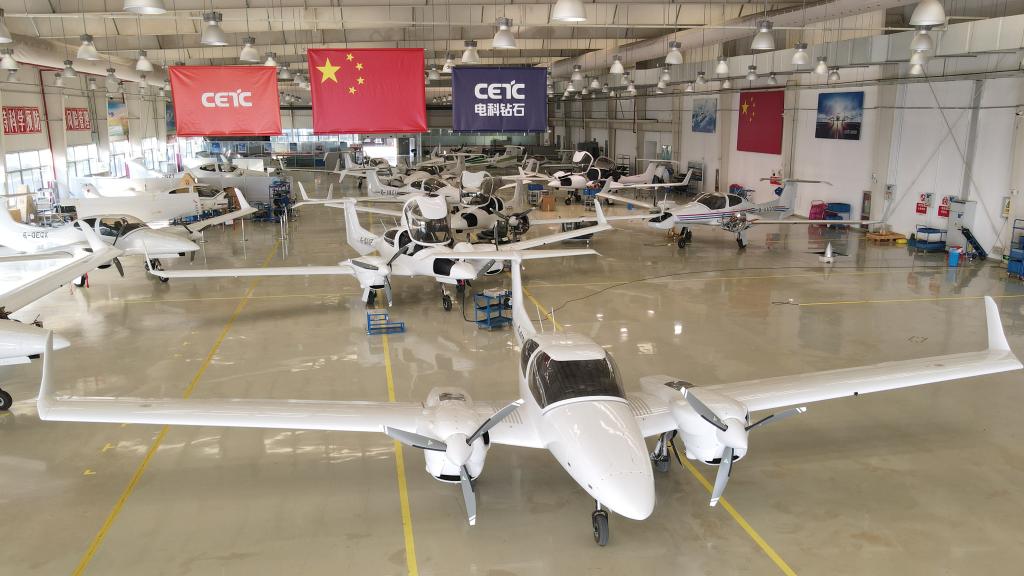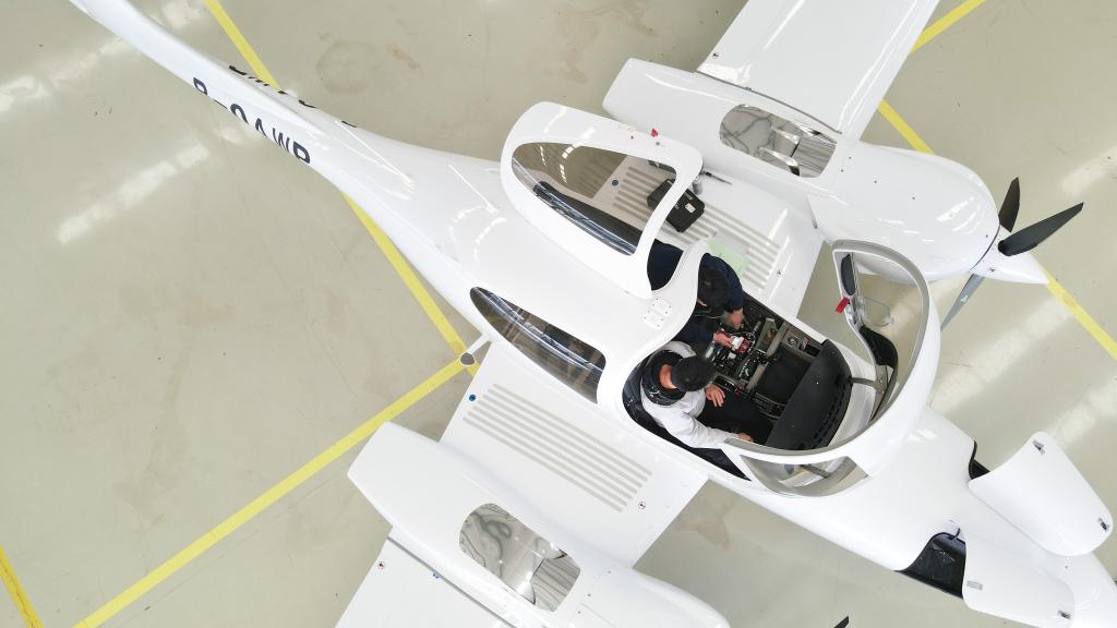 2021年11月16日,在中电科芜湖钻石飞机制造有限公司内,技术人员在进行飞机检测工作。新华社记者 张端 摄