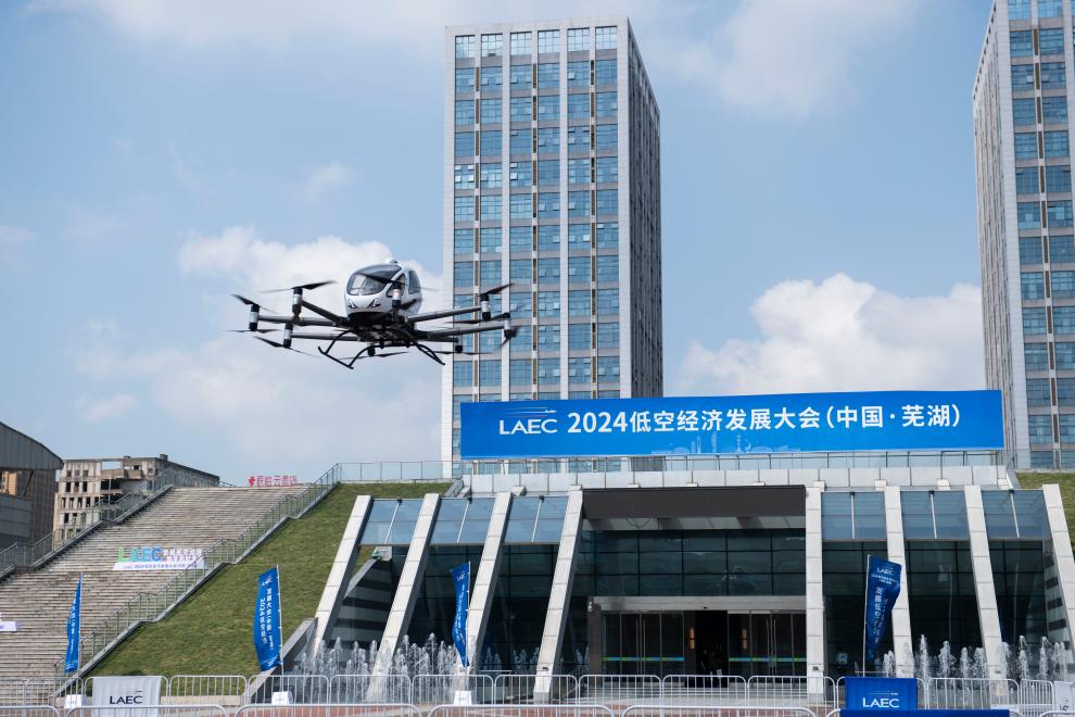 2024年9月6日,在安徽芜湖,一架低空飞行器在2024低空经济发展大会会场外进行飞行展示。新华社记者 傅天 摄