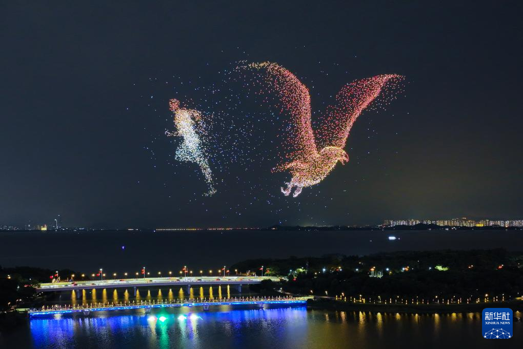 大漠大智控10197架无人机进行编队表演(2024年9月26日摄)。新华社记者 梁旭 摄