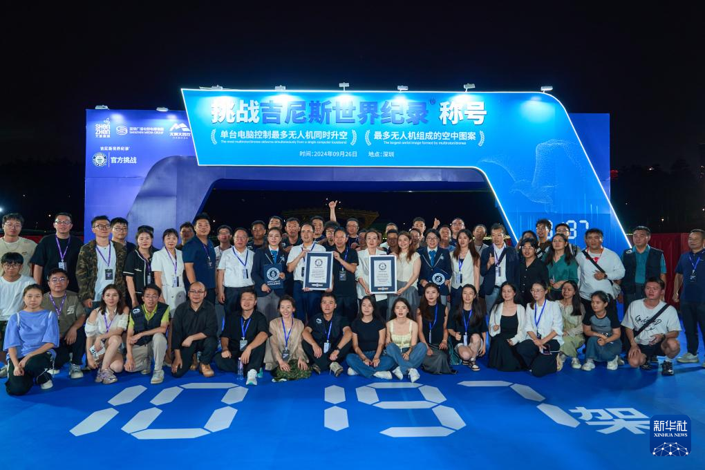 大漠大智控的10197架无人机编队表演创造了“单台电脑控制最多无人机同时升空”“最多无人机组成的空中图案”吉尼斯世界纪录。这是表演结束后,大漠大智控团队成员合影留念(2024年9月26日摄)。新华社记者 梁旭 摄