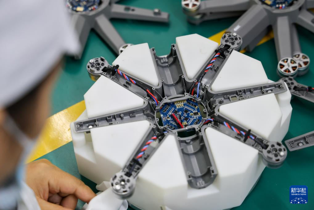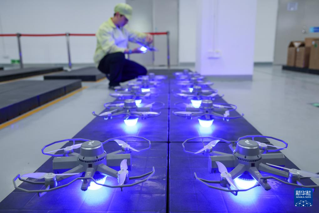 在位于深圳市龙华区的大漠大智控生产车间,工人在检测第四代无人机(2025年3月18日摄)。新华社记者 梁旭 摄