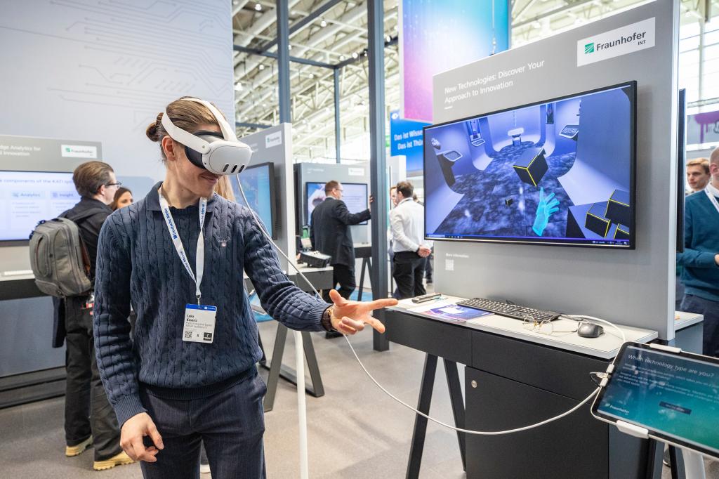 2025年3月31日,在德国汉诺威工业博览会上,一名参观者通过VR设备在虚拟世界中抛掷物品。新华社记者张帆摄