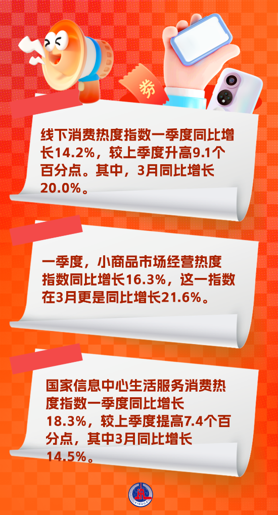 数据显示,一季度,我国消费市场亮点纷呈,呈现向好态势。从线下消费来看,国家信息中心线下消费热度指数一季度同比增长14.2%,较上季度升高9.1个百分点。其中,3月同比增长20.0%,比前两个月高出4.7个百分点,增速持续攀升。