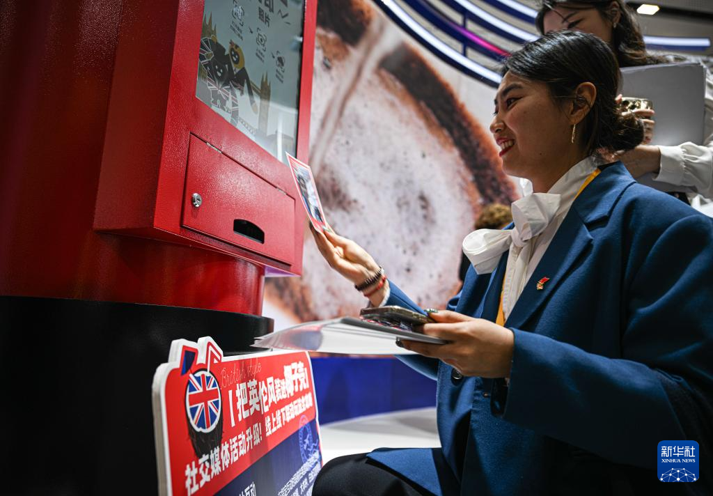 4月13日,观众在第五届消博会英国国家馆体验打印照片。新华社记者 蒲晓旭 摄