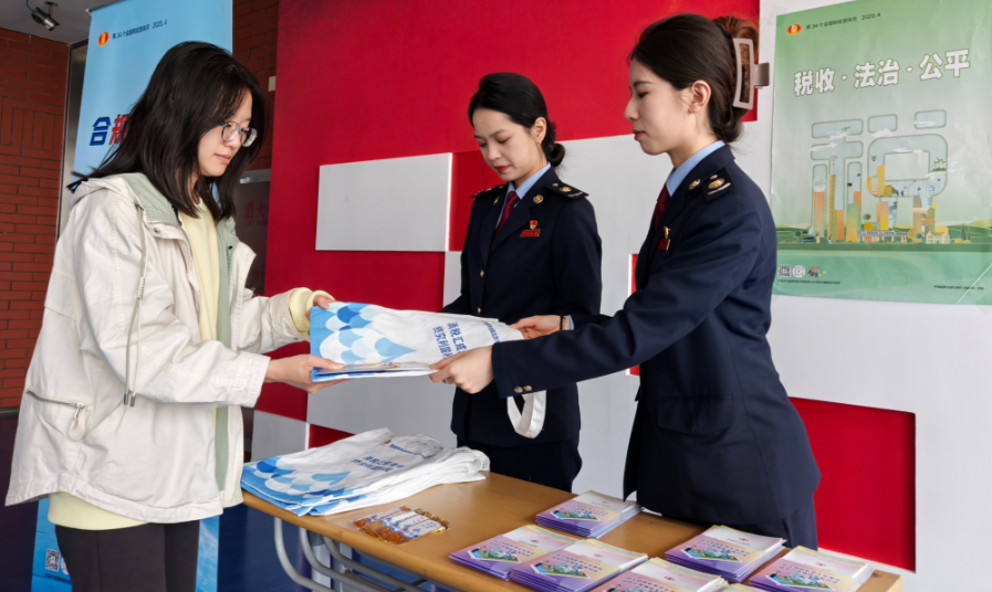 活动当天,教学楼内设置的“税收 法治 公平”宣传点位吸引了众多学生参与。“同学你都知道那些税种?”“工资薪金所得个人所得税起征点是多少?”通过现场答题赢取环保袋及书签等趣味活动,以互动的形式让同学们了解税收与生活息息相关,学习的热情更加高涨。