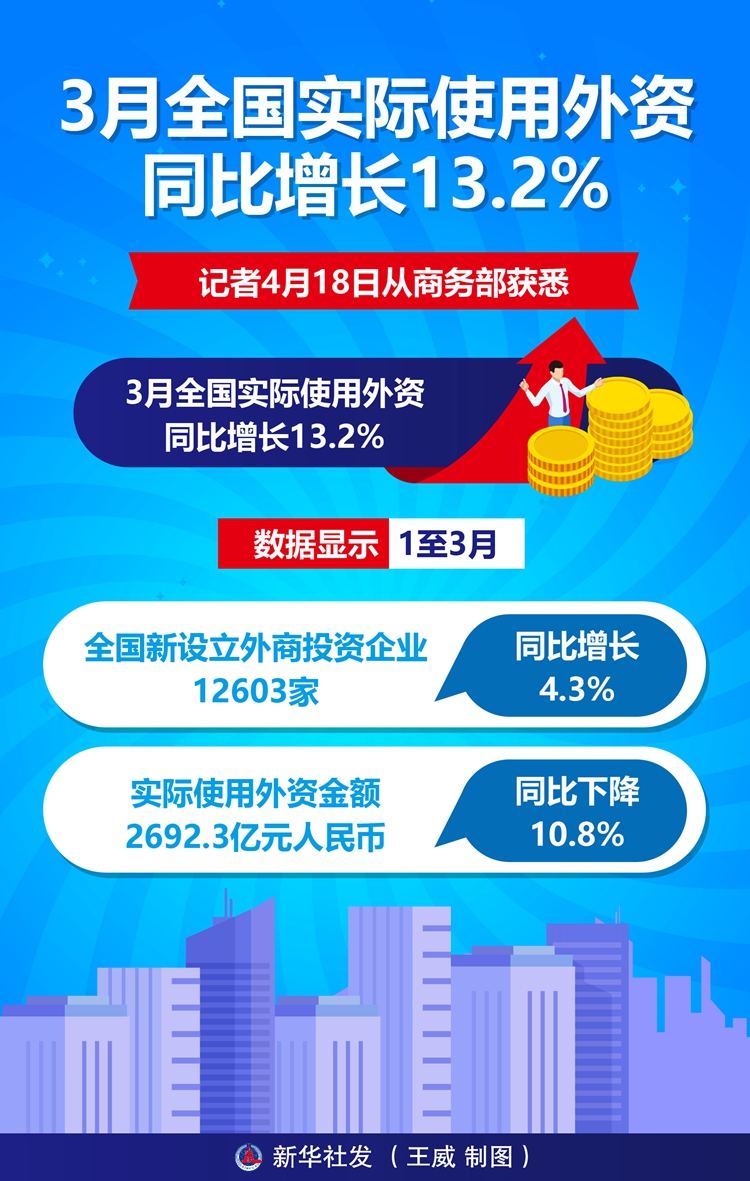 新华社北京4月18日电(记者王雨萧、谢希瑶)记者18日从商务部获悉,3月全国实际使用外资同比增长13.2%。