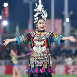 演员在贵州“村超”球场演唱动画电影《哪吒之魔童闹海》中的侗族大歌配乐(2025年3月14日摄)。新华社记者 杨文斌 摄