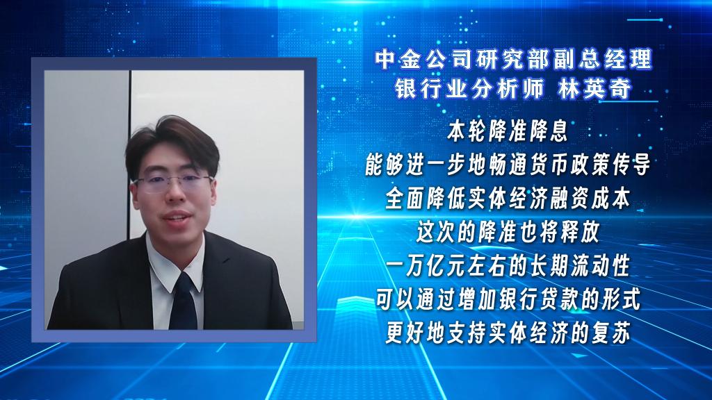 ■中金公司研究部副总经理、银行业分析师林英奇表示,这一轮降准降息能够进一步地畅通货币政策传导,全面降低实体经济融资成本,将释放一万亿元左右的长期流动性,可以通过增加银行贷款的形式,更好地支持实体经济的复苏。