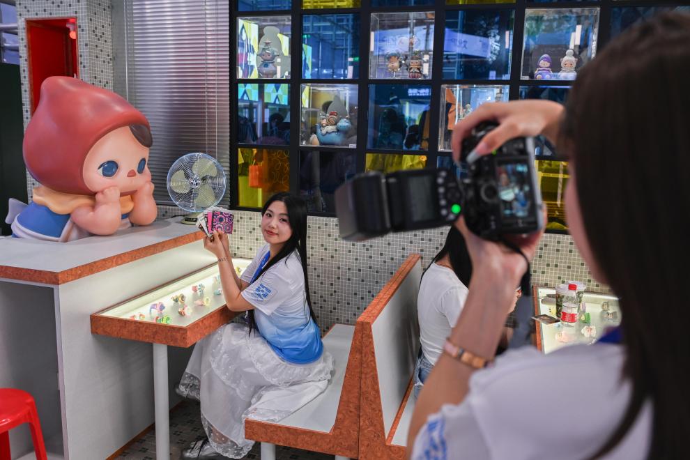 5月22日,观众在文博会香港展区泡泡玛特主题港式茶餐厅打卡拍照。新华社记者 肖恩楠 摄