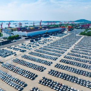 5月14日,在安徽省芜湖港朱家桥港区码头,整齐排列的汽车等待装船出口海外。新华社发(肖本祥摄)