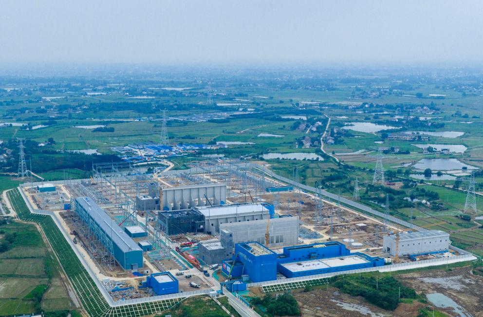 6月26日,±800千伏合州换流站低端换流变压器驶入合州换流站(无人机照片)。新华社发(郑贤列摄)