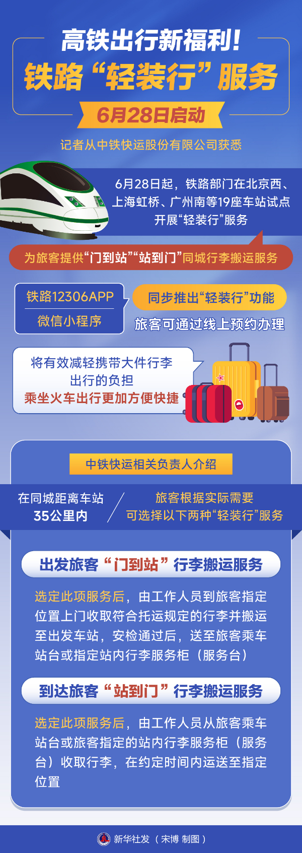 新华社北京6月28日电(记者樊曦)记者从中铁快运股份有限公司获悉,28日起,铁路部门在北京西、上海虹桥、广州南等19座车站试点开展“轻装行”服务,为旅客提供“门到站”“站到门”同城行李搬运服务,铁路12306APP、微信小程序同步推出“轻装行”功能,旅客可通过线上预约办理,将有效减轻携带大件行李出行的负担,乘坐火车出行更加方便快捷。