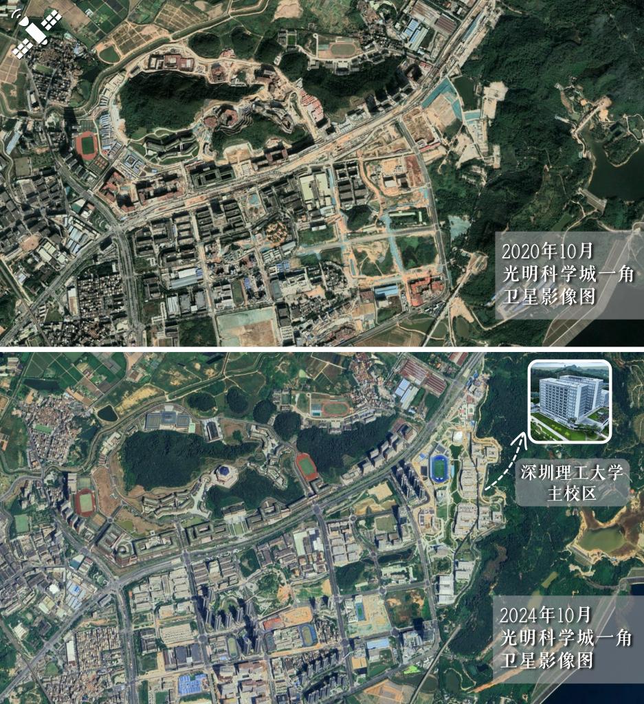 解读:2024年与2020年相比,位于光明科学城内的深圳理工大学主校区建筑群拔地而起。