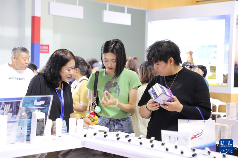 7月6日,一名韩国客商(前左一)在兰洽会上向参会嘉宾推介商品。新华社记者 张智敏 摄