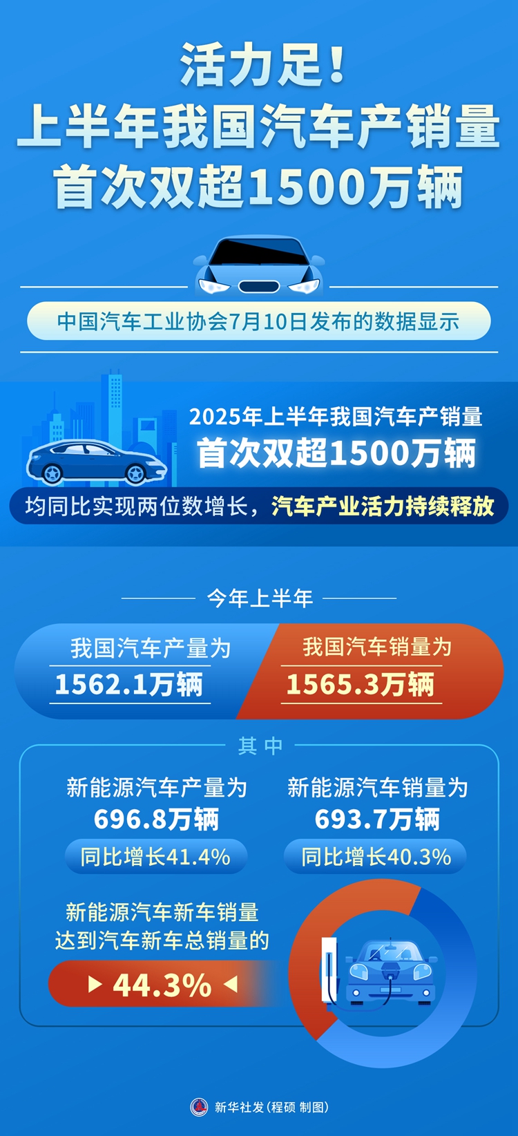 中国汽车工业协会7月10日发布的数据显示,2025年上半年我国汽车产销量首次双超1500万辆,均同比实现两位数增长,汽车产业活力持续释放。