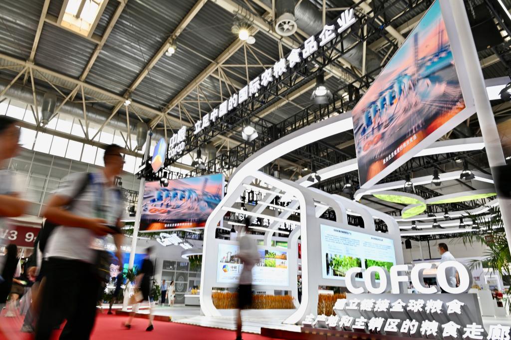 7月19日,观众在第三届中国国际供应链促进博览会绿色农业链展馆经过中粮集团展台。新华社记者陈朔 摄
