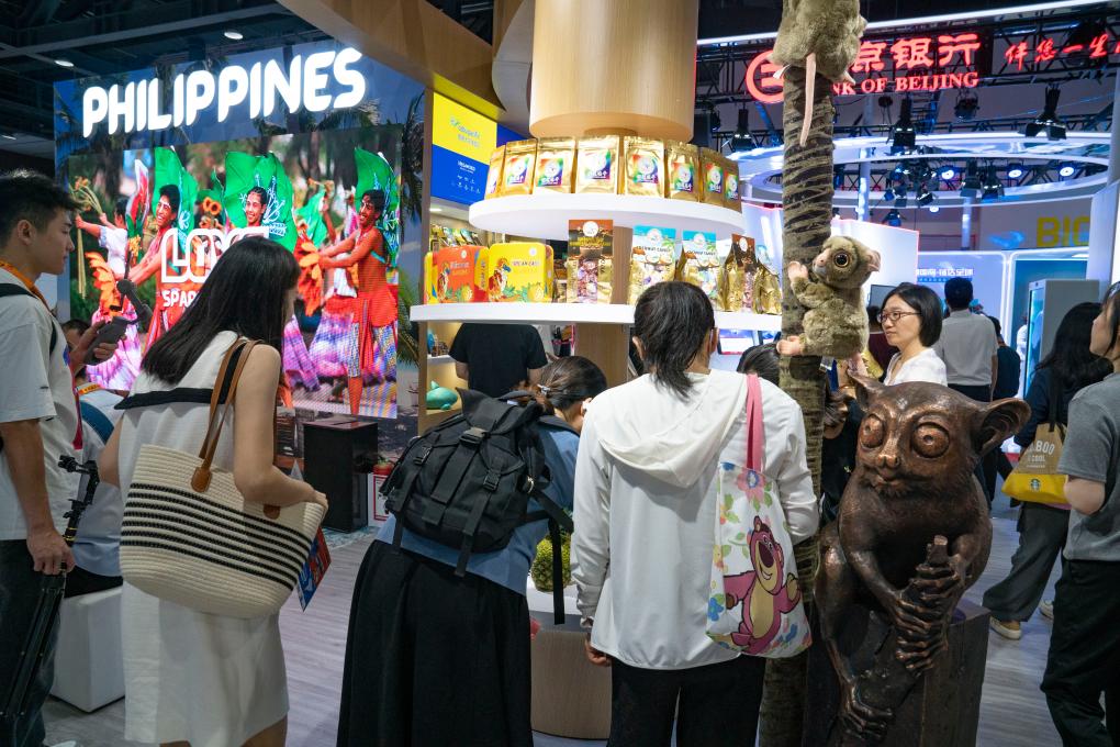 9月10日,在服贸会主题展菲律宾馆,参观者在了解菲律宾商品。新华社记者 丁赫 摄