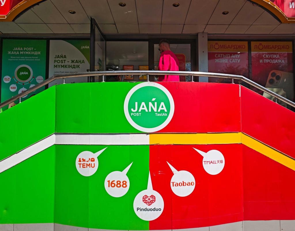 这是9月3日在哈萨克斯坦阿拉木图一家主要负责中国网购平台物流服务的快递网点外拍摄的宣传标识。新华社记者 李任滋 摄