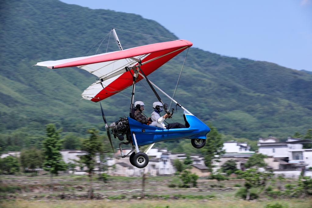 5月17日,在安徽省黄山市黟县宏村航空飞行营地,游客体验三角翼飞行。新华社发(樊成柱 摄)