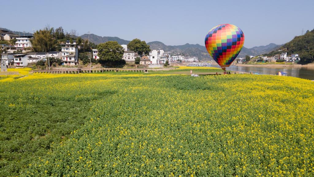 这是3月24日拍摄的安徽省黄山市歙县深渡镇的热气球体验项目(无人机照片)。新华社记者 张端 摄