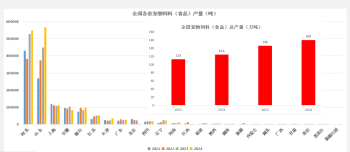 据中国饲料工业协会最新统计,2024年山东省宠物食品产量达56.6万吨,超越河北,东北地区亦呈新兴发展态势。王宗礼称,宠物产业集群效应显著,依托原料、区位等优势实现集群化发展。山东、河北产量占全国近70%,长三角占21%。