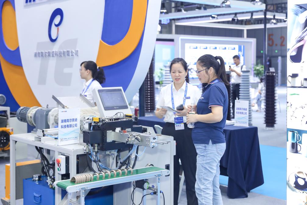 泥料进入机器设备,完成绞碎抽真空、挤压、入模成型三道工序后,不到一分钟,一个杯耳就成型脱模。这是在2025湖南(醴陵)国际陶瓷产业博览会现场,湖南陶尔陶瓷科技有限公司展出的自动化陶瓷杯耳机的工序流程。