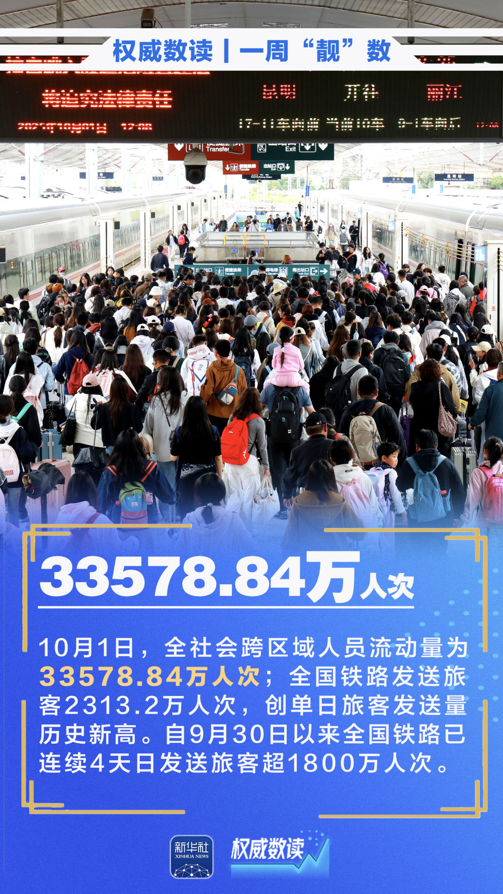 自9月30日以来全国铁路连续4天日发送旅客超1800万人次,运输安全平稳有序;9月份,制造业采购经理指数(PMI)为49.8%,比上月上升0.4个百分点;2024年我国居民数字消费规模达23.8万亿元,相当于当年居民消费的44.2%……本周,这些数据最值得关注!