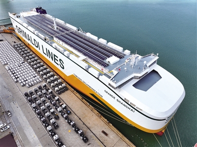 10月14日,在江苏省连云港港东方港务分公司码头,滚装轮装载汽车准备外运(无人机照片)。新华社发(王春 摄)