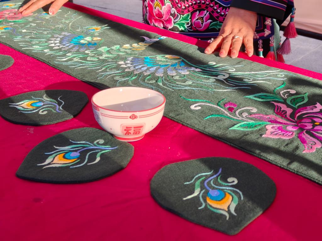 永仁县彝绣产业协会会长李济雁的展台前人潮涌动,她指着一套茶具垫介绍道:“我们融入了花朵、孔雀等彝族文化中寓意美好的元素,配色更显清新雅致,网上的订单一直源源不断。”从“自绣自用”到走向广阔市场,彝绣产业通过“设计培训+订单分配”的模式,将合作社、企业与绣娘紧密联动,不仅为当地彝族妇女开辟了增收渠道,更成为她们实现自我价值的重要平台。