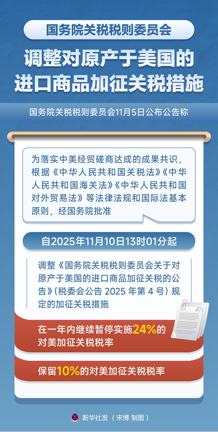新华社北京11月5日电 国务院关税税则委员会11月5日公布公告称,为落实中美经贸磋商达成的成果共识,根据《中华人民共和国关税法》《中华人民共和国海关法》《中华人民共和国对外贸易法》等法律法规和国际法基本原则,经国务院批准,自2025年11月10日13时01分起,调整《国务院关税税则委员会关于对原产于美国的进口商品加征关税的公告》(税委会公告2025年第4号)规定的加征关税措施,在一年内继续暂停实施24%的对美加征关税税率,保留10%的对美加征关税税率。