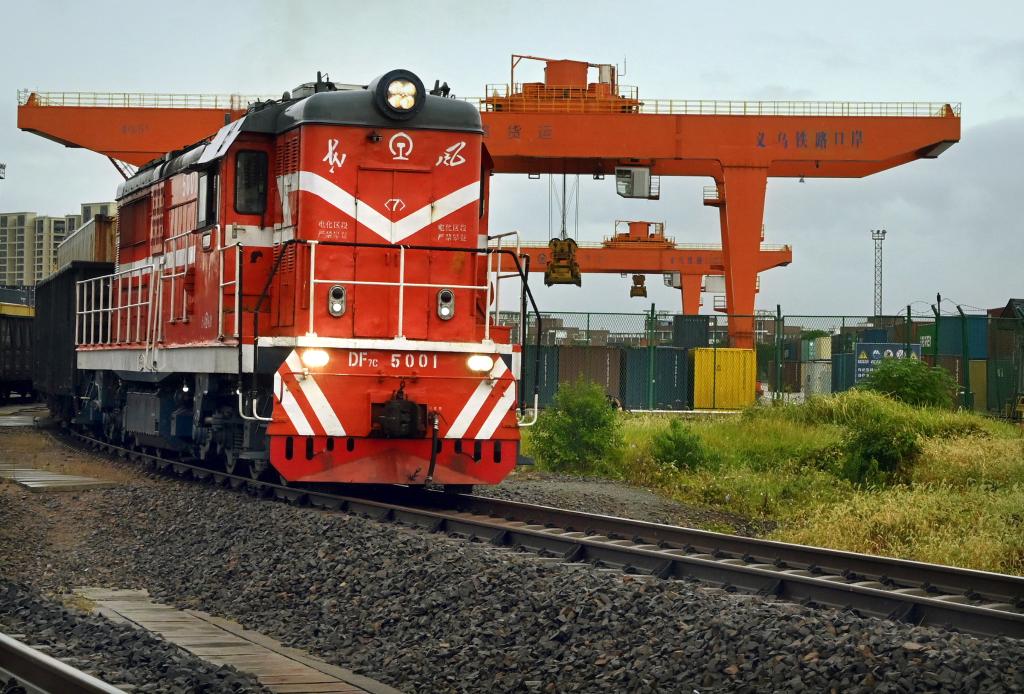 10月14日,一列开往中亚地区的货运专列驶出义乌铁路口岸。新华社发(王颂 摄)