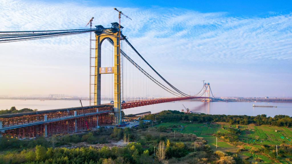 燕矶长江大桥所在江面宽阔、水文条件复杂、四主缆钢桁梁吊装精度要求高。“为保障大桥顺利合龙,我们精确计算温度、风力等环境因素对钢桁梁形变的影响,最终钢桁梁以毫米级的精度平稳嵌入预定位置,南北两岸顺利‘牵手’。”中交二航局燕矶长江大桥项目总工程师罗航说。