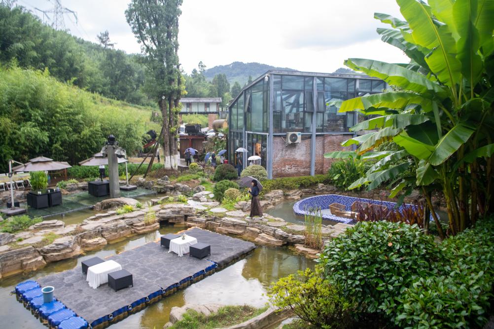 2025年8月15日拍摄的用矿山遗址改造的民宿。近年来,重庆市梁平区竹山镇猎神村立足自然资源优势,积极推动林业相关产业融合发展,将原有矿山塌陷区域进行功能重构和空间再塑,打造有山有水的小微湿地群落。新华社记者 唐奕 摄