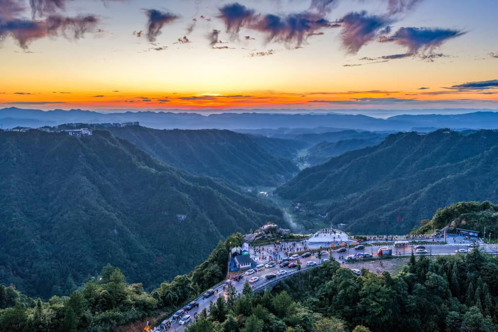2025年8月20日,游客在重庆市石柱县黄水镇环湖路观景台欣赏晚霞景色(无人机照片)。新华社记者 唐奕 摄
