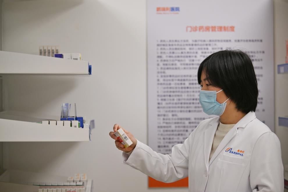 2025年2月26日,医护人员在天津鹏瑞利医院门诊药房查看药品。新华社记者 李然 摄
