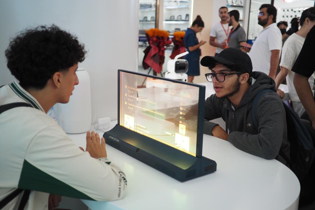 2025年10月14日,两名外籍客商在义乌全球数贸中心体验AI翻译互动屏。新华社记者 刘梓漪 摄
