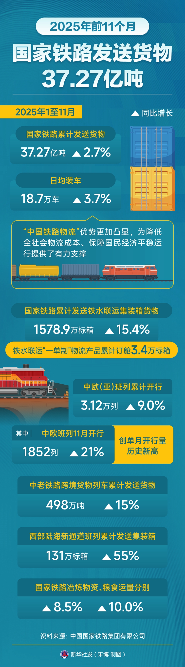 新华社北京12月19日电 记者19日从中国国家铁路集团有限公司获悉,今年1至11月,国家铁路累计发送货物37.27亿吨,同比增长2.7%;日均装车18.7万车,同比增长3.7%,“中国铁路物流”优势更加凸显,为降低全社会物流成本、保障国民经济平稳运行提供了有力支撑。